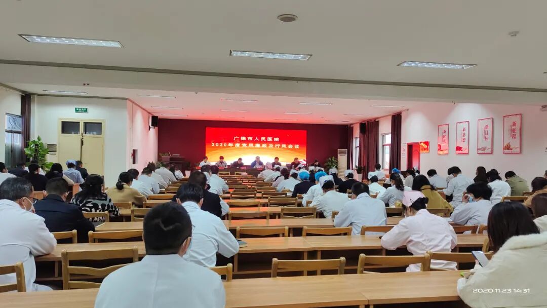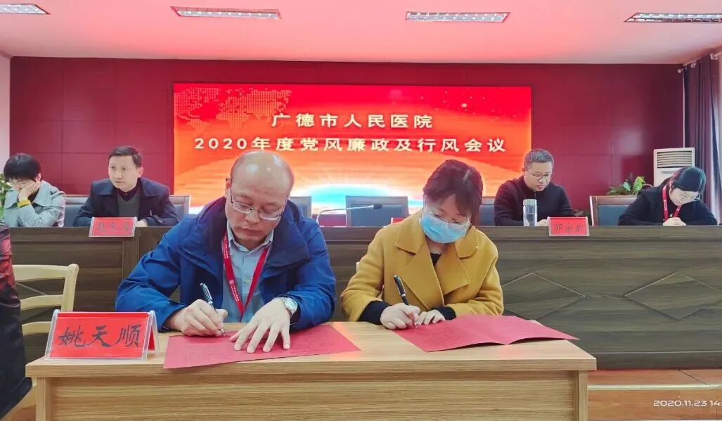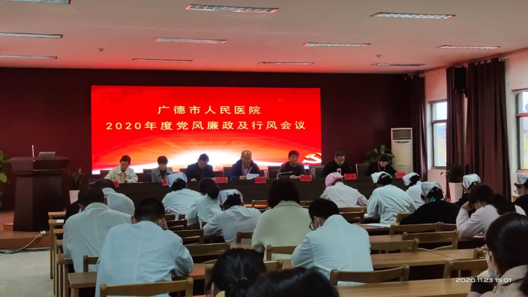2020年11月23日,广德市人民医院召开了2020年党风廉政建设和行风建设工作会议。医院领导班子出席会议,职能科室负责人、各党支部书记及支委委员参加会议。会议由党委书记姚天顺主持。